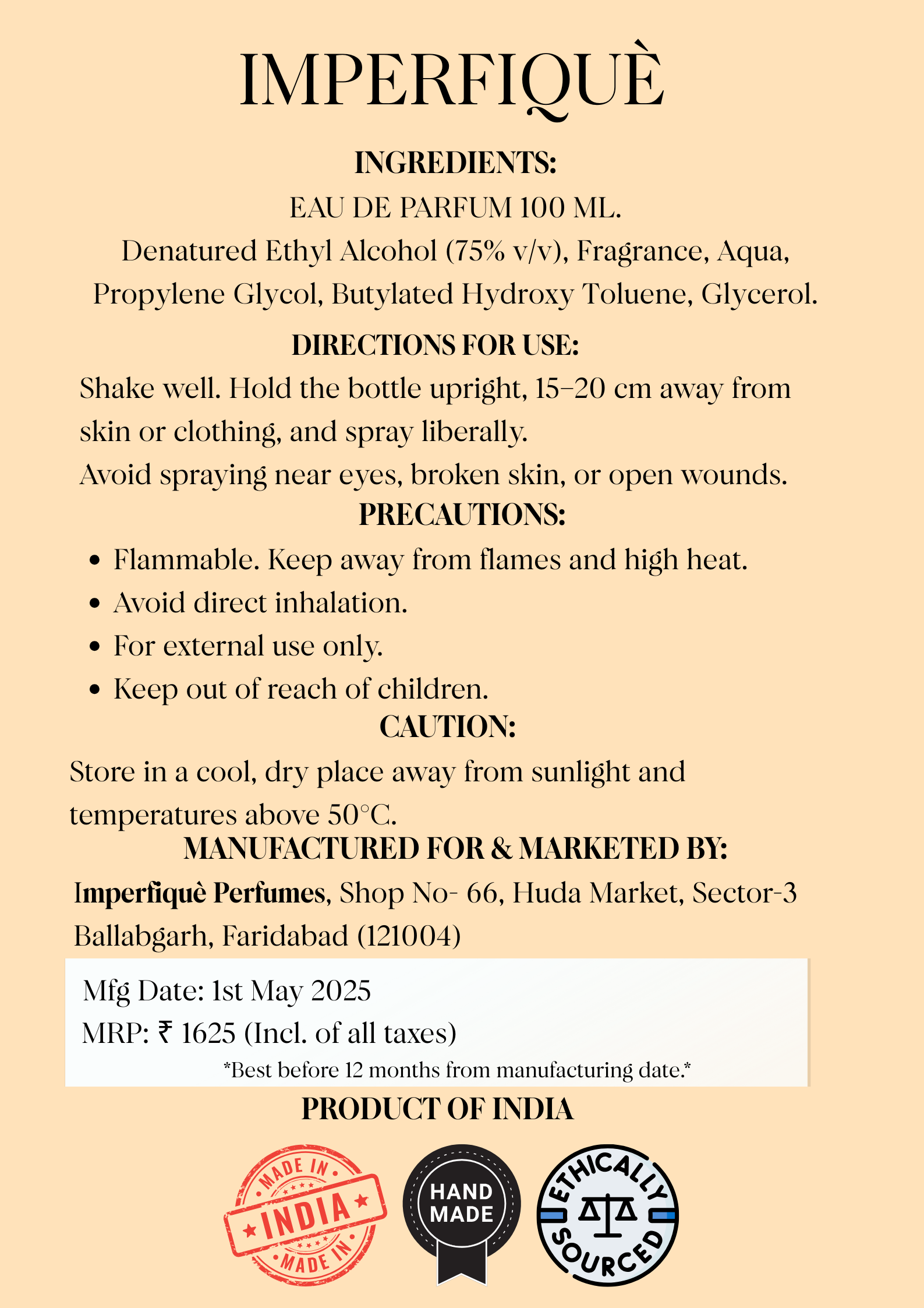 The soul of the fragrance: Agarwood, deep and resinous, anchors the composition with its smoky, noble signature. Woody notes add earthy elegance, while labdanum, rich and ambery, leaves a mysterious, lingering trail. This is where imperfection becomes identity.